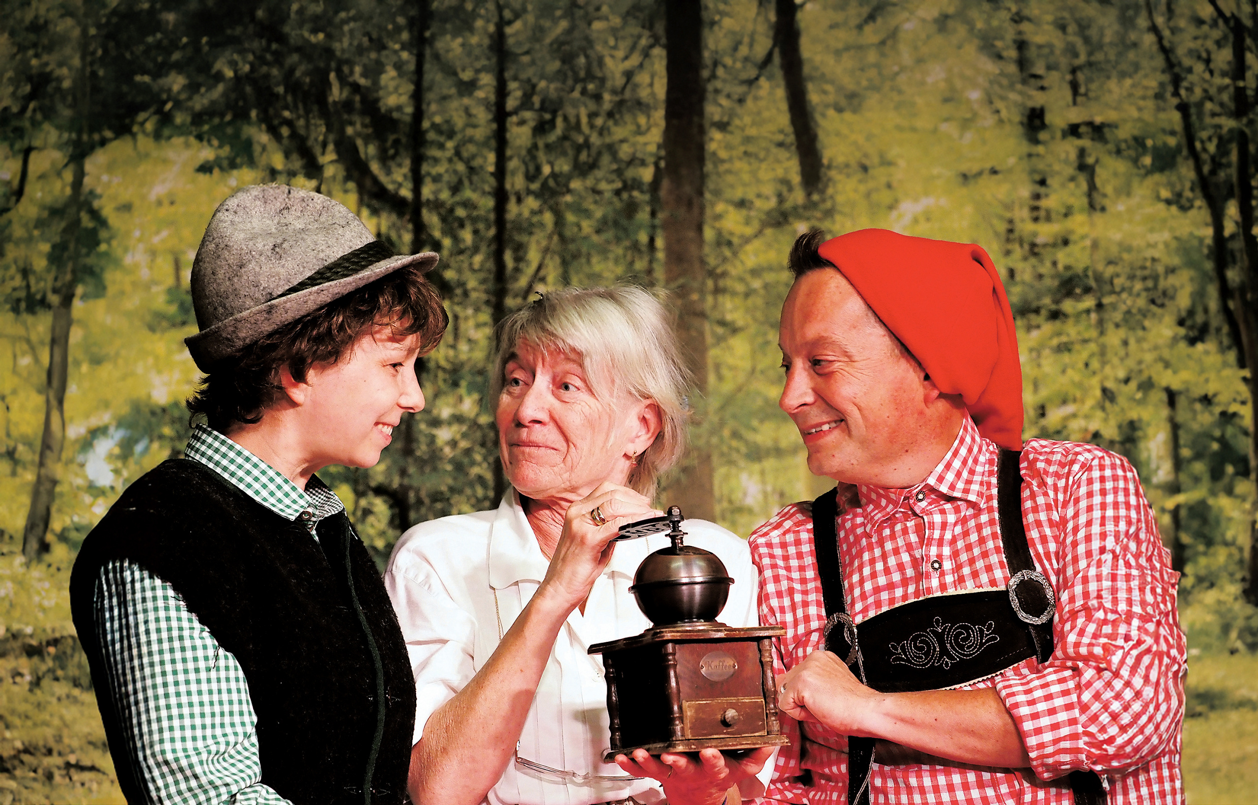 Die Großmutter (Sylvia Glismann) freut sich über die Kaffeemühle, die Seppel (Marcia Talleur, li.) und Kasperl (Marc Wiens) ihr schenkten.